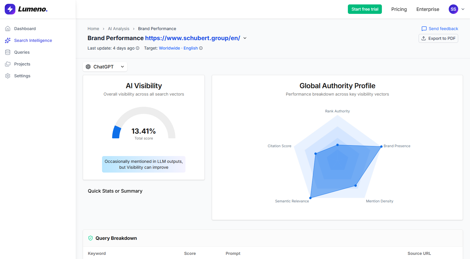 Optimize brand visibility across the generative search landscape. Analyze, track, and influence how LLMs synthesize your data.